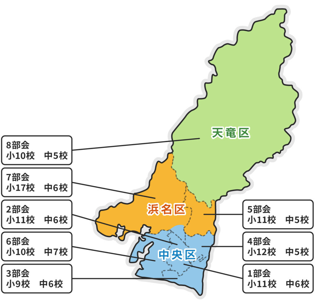 | 小学校 11校 | 追分小 広沢小 萩丘小 富塚小 城北小 花川小 葵が丘小 泉小 佐鳴台小 瑞穂小 附属浜松小 |